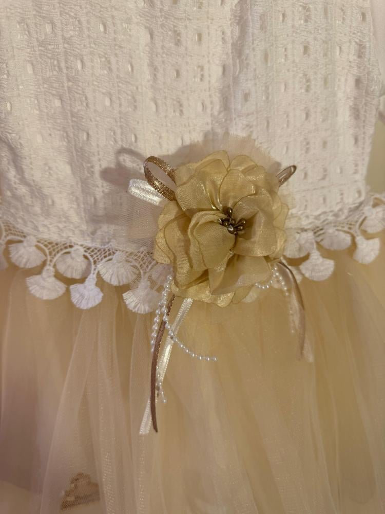 التنورة: طبقة من التول الناعم، بلون مشمشي سكّري، خفيف جدًا، ينساب بسهولة مع حركة البيبي، ويعطي شكل ناعم في الصور. اللمسات الإضافية: في منتصف الخصر وردة صغيرة بلون وردي خوخي، مزينة بأشرطة ذهبية ناعمة وخرز لؤلؤي مرتب. التفاصيل كلها خفيفة ومثبتة بإتقان، عشان تعيش وتتحمل المناسبات.