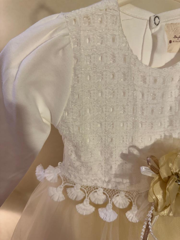 تخيلّي معي سحابة دانتيل ناعمة تتراقص حول ملاكك الصغير، فستان "البهجة" من الحُسن بوتيك مصمَّم ليخلي كل مناسبة لحظة ما تنتسى. الفستان مصمم بلمسة هادئة، بلون عاجي ناعم وقماش تول مشمشي انسيابي، يناسب الأجواء الاحتفالية ، ويعطي طفلتك راحة وأناقة في نفس الوقت. تصميمه الكلاسيكي يعطي شعور بالترتيب والنظافة، وفيه وردة وسط الخصر تضيف لمسة أنثوية بسيطة، مزينة بأشرطة ذهبية وخرز لؤلؤي خفيف.